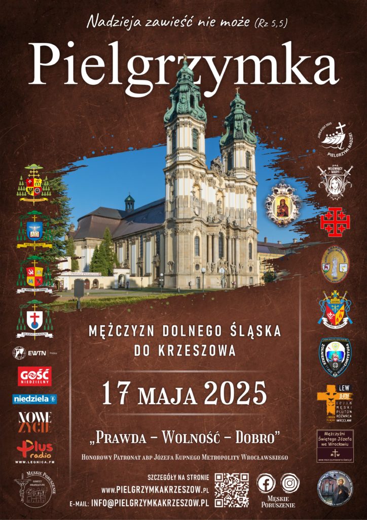 W dniu 17 maja 2025 zapraszamy na wyjątkową pielgrzymkę, tylko dla mężczyzn do sanktuarium w Krzeszowie w godz. 9.00 – 17.00. Można zapisać się na autokar lub przyjechać swoim transportem. Przewidziany bogaty program dla każdego mężczyzny.